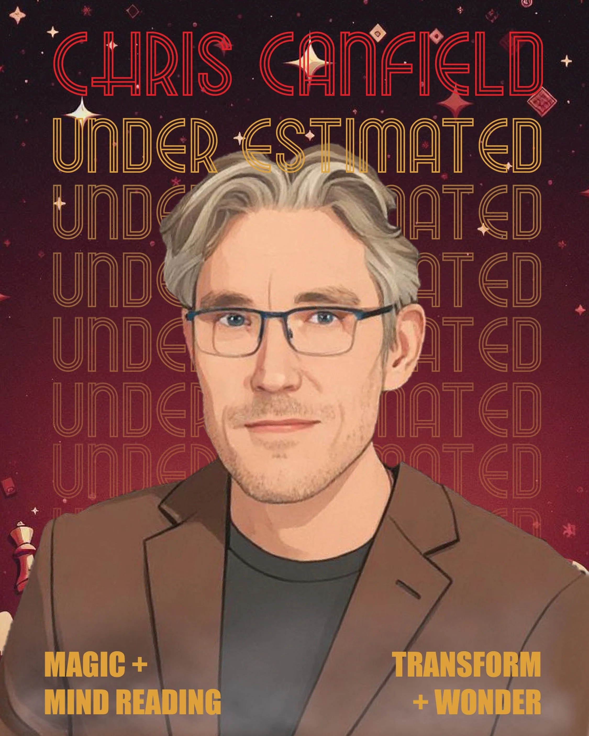 Chris brings his magic and mind reading show ‘Under Estimated’ to your space. This performance engages the entire audience while keeping everyone full of suspense, surprise, and wonder. Highly interactive, you will see unique magic with cards, coins and other objects and original mind reading designed for more intimate settings.